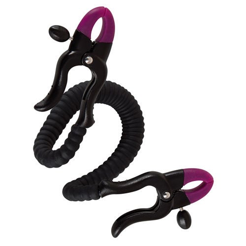 Deze schaamlippenspreider met klemmen is een fantastisch hulpmiddel om verschillende standjes uit te proberen. Met de spreider wordt de G-spot geprikkeld en de clitoris blootgelegd. De geribbelde textuur stimuleert de penis tijdens de penetratie. De spreider is gemaakt van buigzame draden met een geribbelde siliconen laag. De draad kan naar eigen voorkeur worden gebogen en de knijpkracht van de klemmen kan aangepast worden met de schroeven aan de buitenkant. Zet de twee klemmen eenvoudig vast op de buitenste schaamlippen en het avontuur kan beginnen.