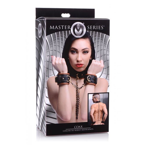 Deze luxe bondage set uit de Master Series collectie mag niet ontbreken in jouw BDSM domein. De boeienset is gemaakt van sterk, robuust kunstleer en wordt verbonden door sterke goudkleurige kettingen. De boeien en halsband zijn cognackleurig onderlegd waardoor er een gewaagd contrast ontstaat. Durf jij het aan?