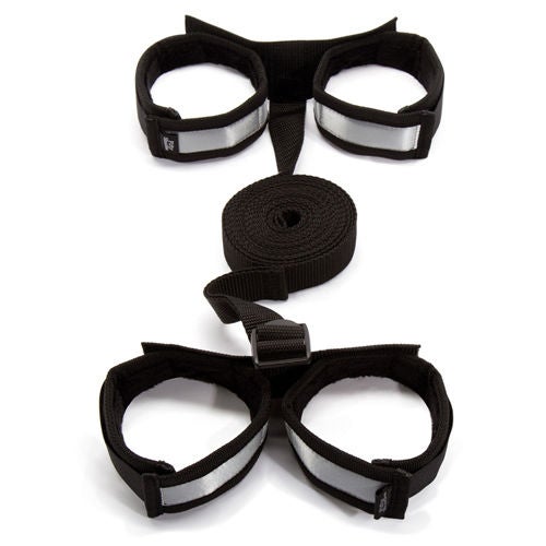Deze banden voor het bed (hand- en voetboeien) zijn geschikt voor alle types bedden. Sluitingen van klittenband. Schuif de banden aan de boven- en onderkant van het matras door en laat er een stuk uithangen zodat de handen en voeten in de boeien kunnen. Inclusief een oogmasker en deurhanger.