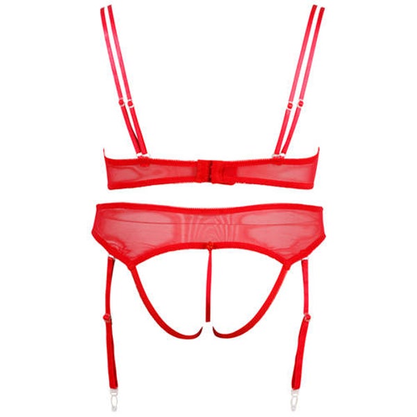 Rode BH set met afneembare kanten cups en twee paar jarretels plus jarretel gordel. Één paar jarretels is afneembaar, het andere paar is in lengte aan te passen. Met haak sluiting aan de achterkant. De beugel BH is licht gevoerd. De kanten stof in de string is te verwijderen. Door alle afneembare stukken kun je zelf bepalen hoe uitdagend je dit lingerie setje wilt dragen!