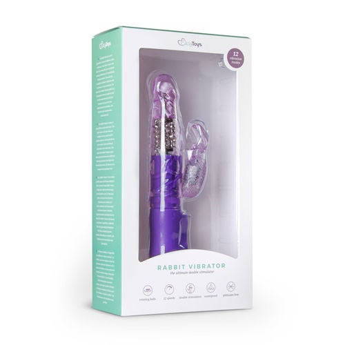 Paarse rabbit vibrator van EasyToys. Deze rabbit vibrator stimuleert op twee manieren tegelijkertijd! Geniet van een heerlijke clitoris stimulatie terwijl ondertussen de ronddraaiende kralen jouw vagina masseren. De fantastische interne sensatie gecombineerd met de trillingen op je clitoris zorgen voor adembenemende resultaten. Bovendien weekmakersvrij en waterproof voor extra plezier met water. Kies een van de 12 verschillende vibratie standen en rotatiesnelheden, er zit altijd een juiste voor jouw stemming bij!