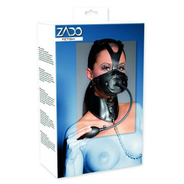 Bij de mond opening kunt u de latex oppompbare penis-vormige knevel bevestigen met twee drukknopen. Tevens een riem met handgreep die aan de brede halsband te bevestigen is voor vele onderdanige spelletjes.