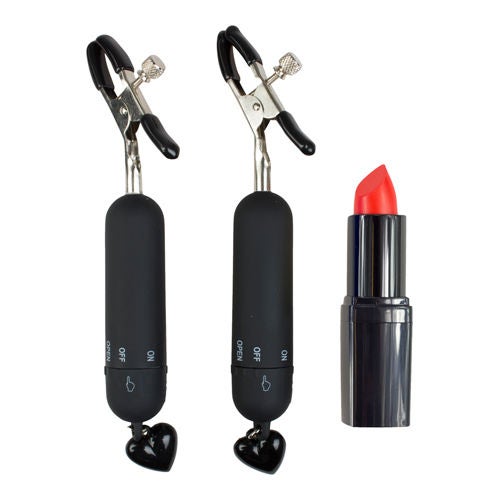 Zwarte vibrerende tepelklemmen van Bad Kitty met kleine hartvormige hangers aan de onderkant. De clips zijn in sterkte aan te passen zodat je zelf mag kiezen hoe strak je ze wilt hebben. Zet vervolgens de trilling aan en geniet nog meer van deze opwindende tepelklemmen!